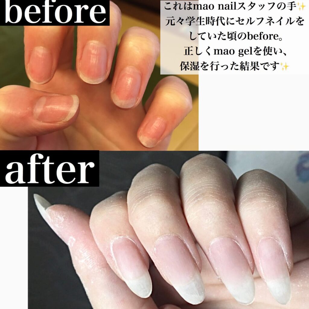元々学生時代にセルフネイルをしていた頃のbeforeで、正しくmao gelを使い、保湿を行った結果afterのようになりました。