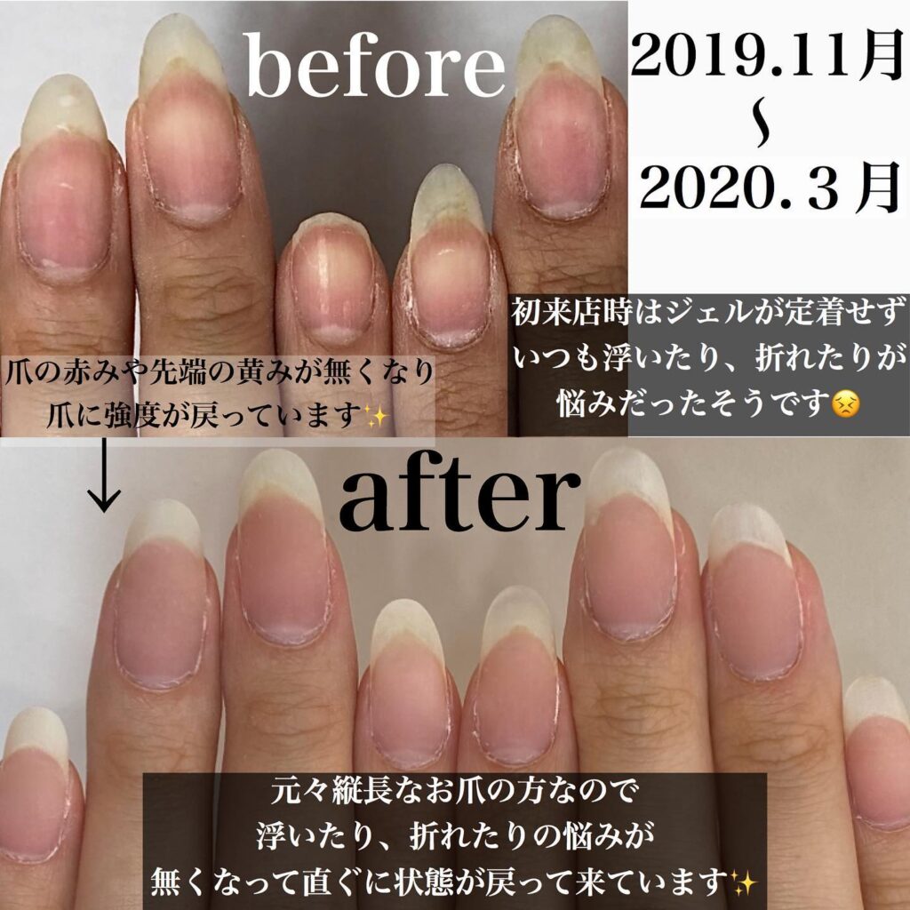 5ヶ月で爪の赤みや先端の黄みが無くなり、爪に強度が戻っています◎元々、縦長の爪のお方なので、すぐに状態が戻ってきています。