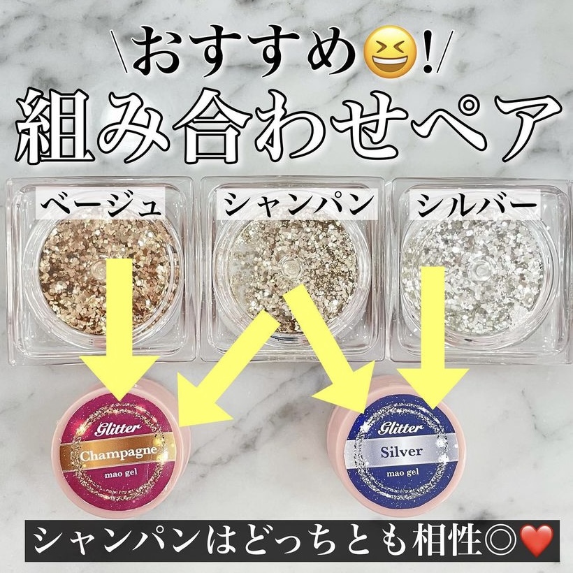 マオラメ(シャンパン)は、どちらのchampagne、silverどちらのジェルとも相性が良いです◎