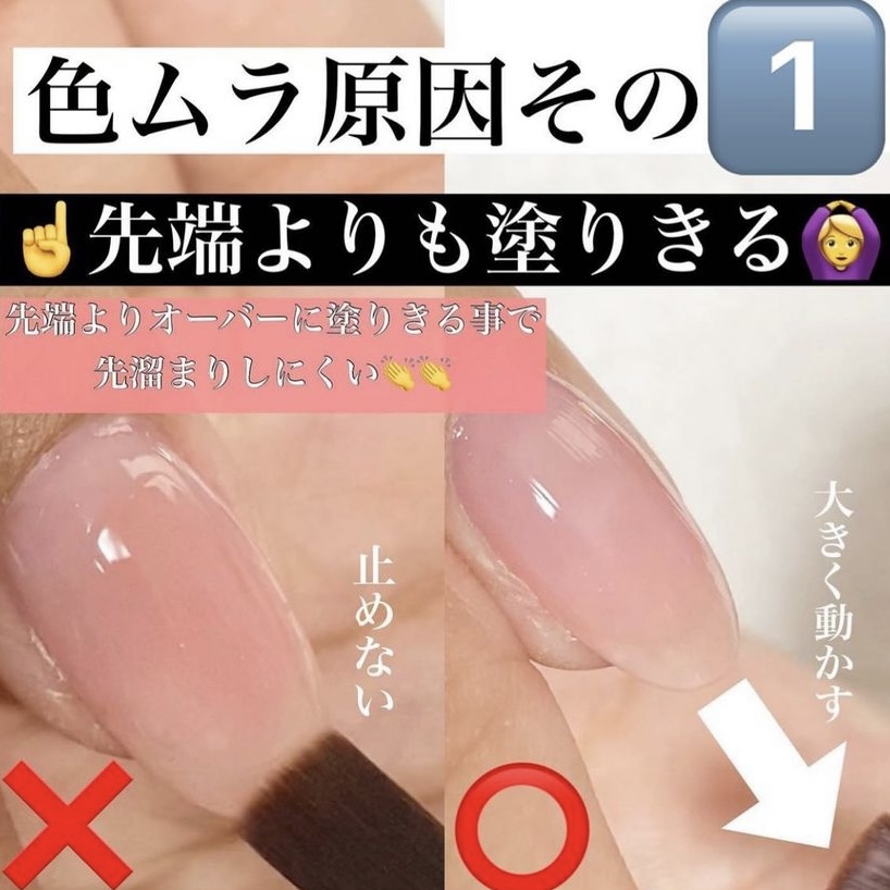 筆を爪の先端で止めてしまうとジェルが溜まってしまうので、筆を大きく動かし、先端よりもオーバーに塗りきります.