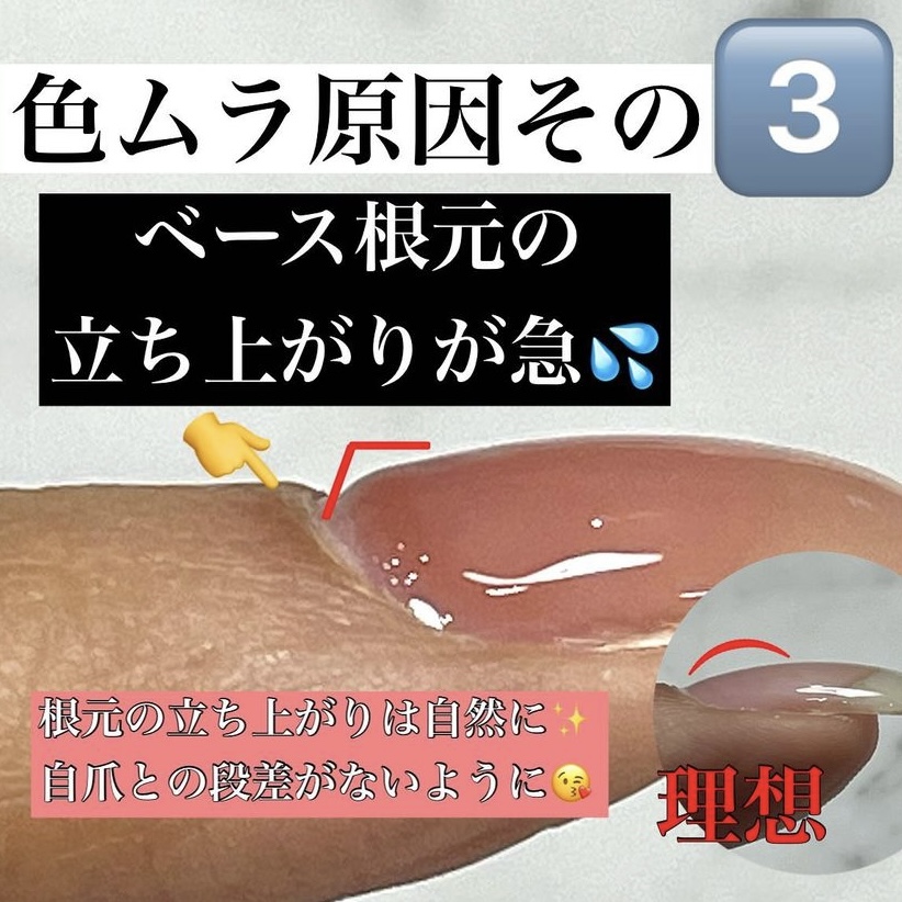 ベースを塗布した際に、根元の立ち上がりが急だと、段差部分が濃くなってしまいます.