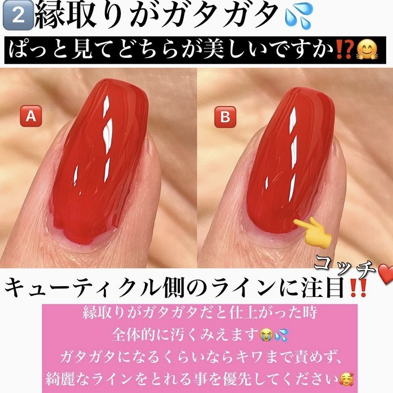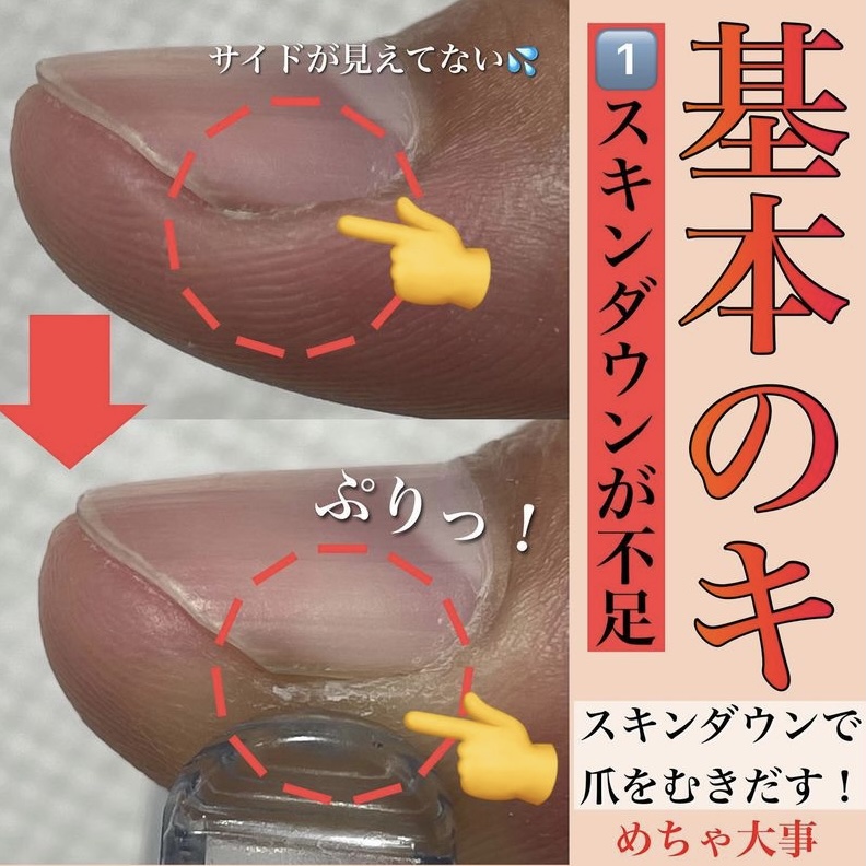スキンダウンしてしっかりと爪を剥き出しにして、サイドの塗りもれ、皮膚につくことを防ぎます.