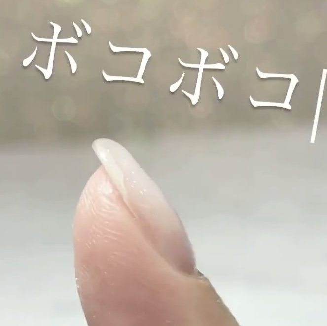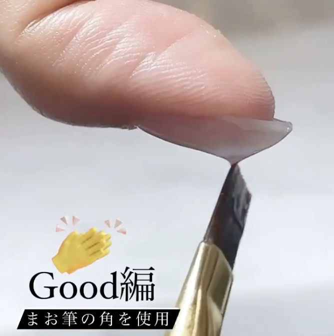 慣れないうちは、ジェルを誘導するではなく、ジェルを拭い取ってしまい、表面をボコつかせてしまいます。上記のポイントを気にしながら、筆の角をほんの少しだけジェルの表面につけて、ジェルを動かしている見てください♩