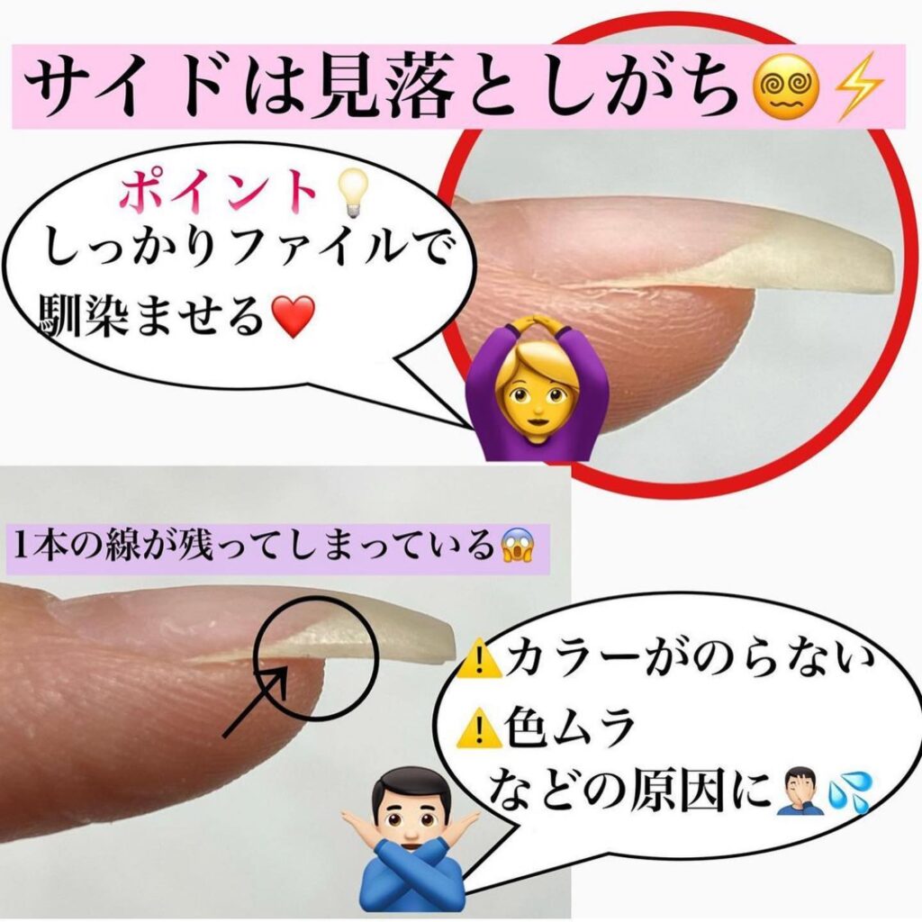 フィルインでの注意点 2022-07-202022-07-19 今回は、フィルインでの注意点をご紹介します^^ 1.ポイント × 1本の線が残ってるカラーがのらない、色ムラの原因になる ◎ しっかりファイルで馴染ませる爪のカーブにファイルの向きを沿わせて、同じ方向から優しく!表面はもちろん、見落としがちなサイドまで美しく! 2.最後に いかがでしたか?♡表面をよく見て、際までつるんっと仕上げましょう! Instagramでも更新中 この投稿をInstagramで見る 綺麗になるお手伝いさせてください❤(@maonail)がシェアした投稿