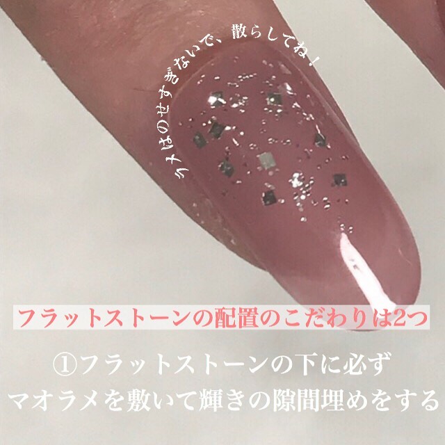 フラットストーンの下に必ずマオラメを敷いて、輝きの隙間埋めをする。ラメはのせすぎないで散らしましょう!