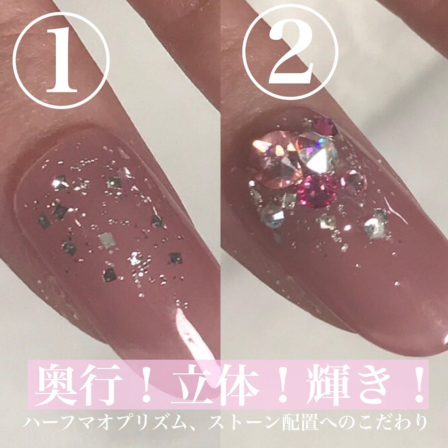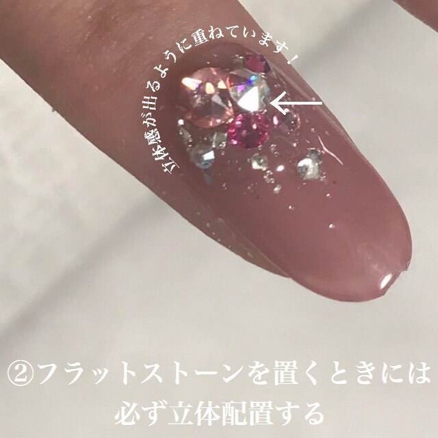 ②往年のスタイルでフラットストーンをペタペタのせただけ。左がストーンを立てかけて立体感を持たせた配置となります。こうやって比べると一目瞭然!往年のスタイルには昭和感がありますよねw立体配置に変えるだけで一気に垢抜けることができます◎