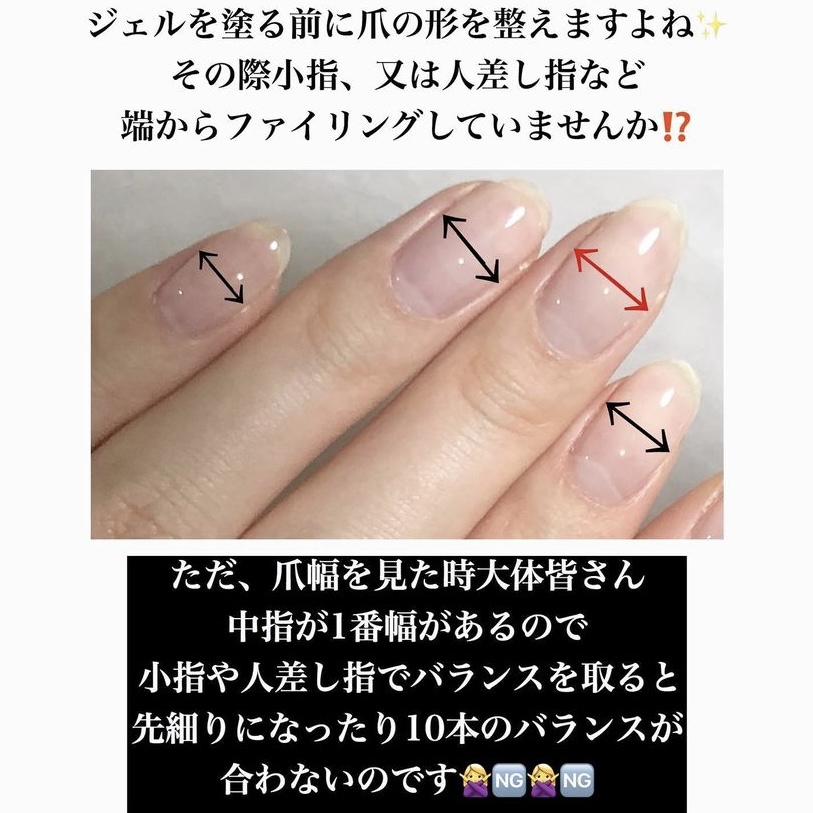 爪幅を見た時大体皆さん中指が1番幅があるので、小指や人差し指でバランスを取ると先細りになったり、10本のバランスが合いません。