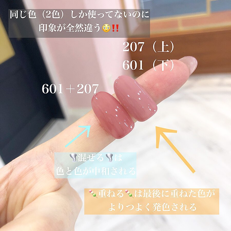 今回は、ジェルを重ねる、混ぜるでどのような違いが出るのかをご紹介します^^