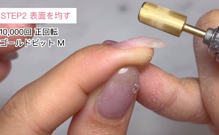 カラーをオフしたままの状態だと表面が凸凹しており、次のネイルに影響があるので、ビットをミディアムに変えて表面の凸凹をならしていきます.