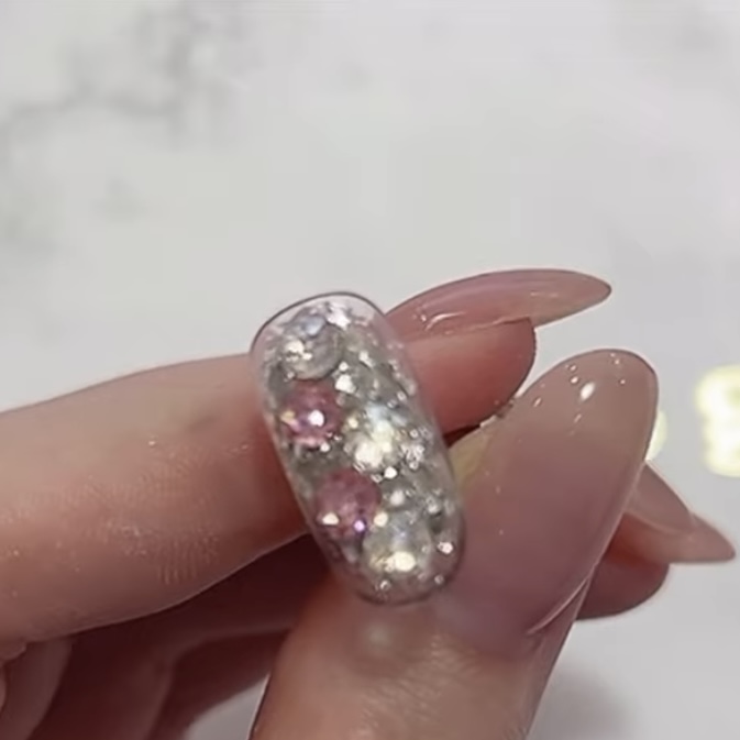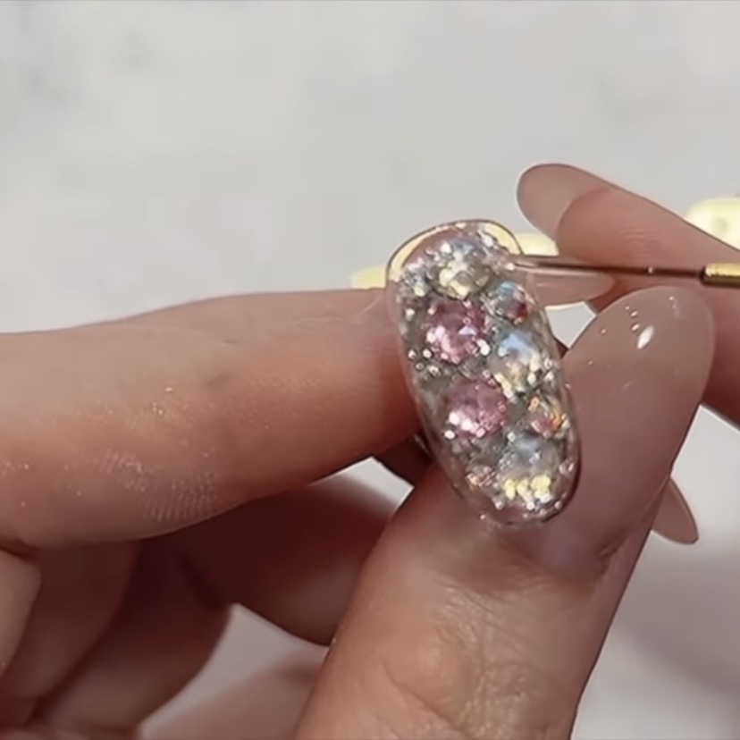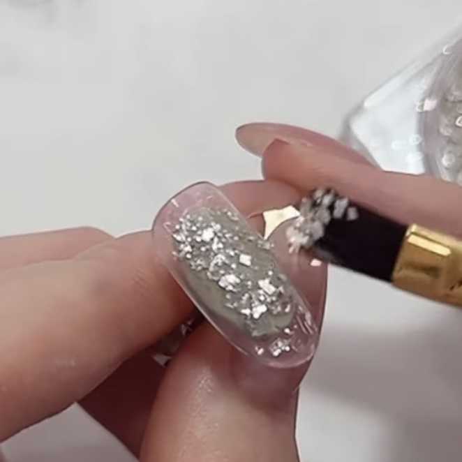 筆に少量のヌレコをつけたらラメを取り、ベースを塗ったお爪に塗布していきます.