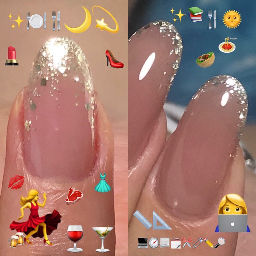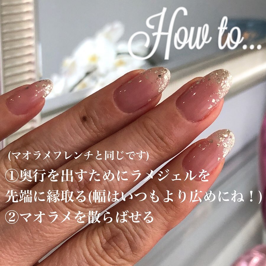 「マオラメフレンチ」のラメをついつい規則正しく並べてしまう方は、「幅広マオフレンチ」から始めてみましょうっ!幅広は大胆にラメを動かせるので、抜け感や散らす感覚を掴みやすいと思いますよ♩