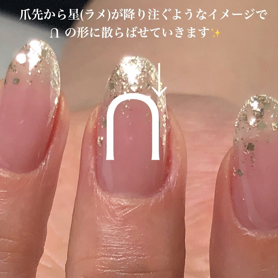 ③爪先から星(ラメ)が降り注ぐようなイメージで「∩」の形に散らばせる
