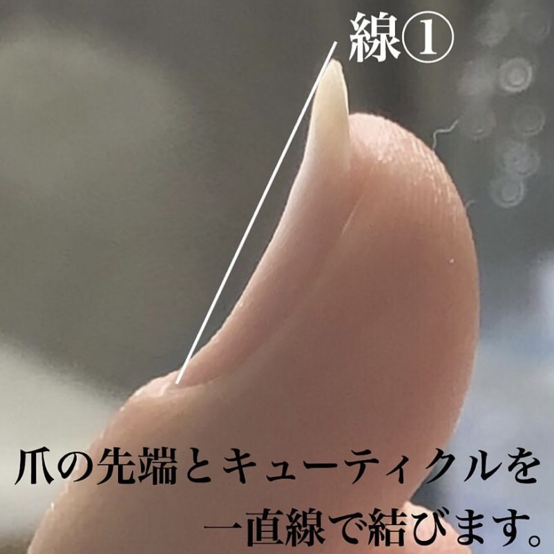 ・まずは爪の先端とキューティクルを一直 線で結びます。 (線①)