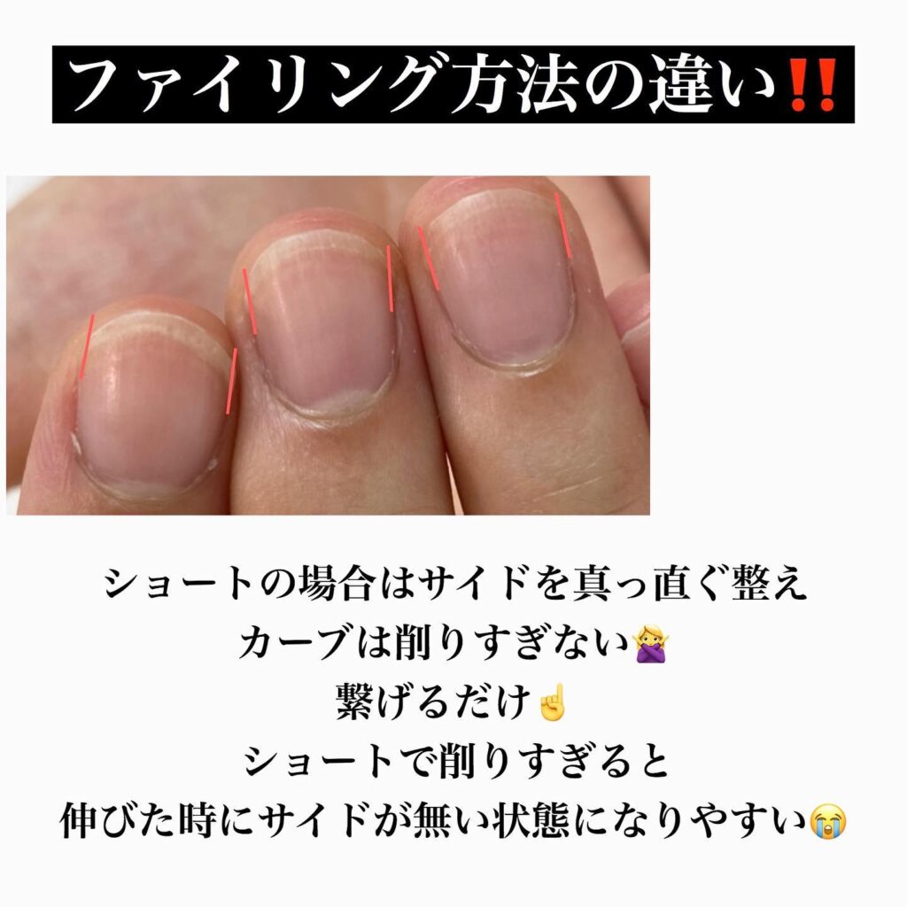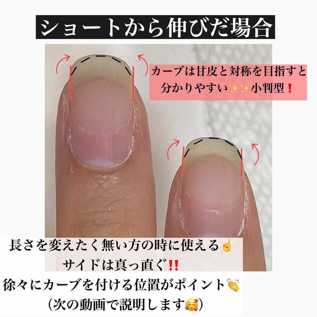 サイドは真っ直ぐ!徐々にカーブを付けるのがポイント!最初から斜めに削ってしまうと、横幅が太く見えます。カーブは甘皮と対称を目指すと分かりやすくて◎小判型に!長さを変えたく無い時に使えます。