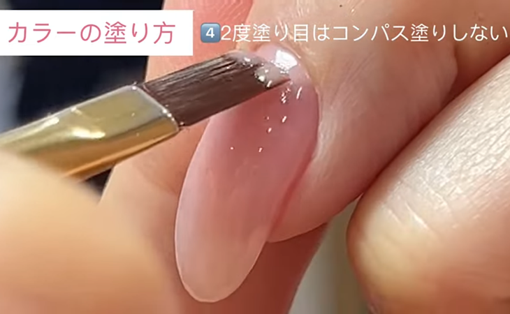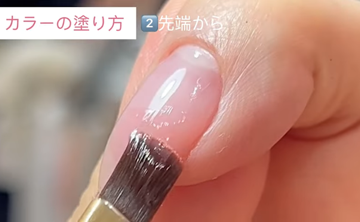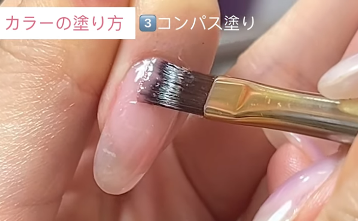 先端から順番に馴染ませるようにトントンとしながら塗布していきます。この時、根元もコンパス塗りせずに馴染ませ、硬化したら完成です。