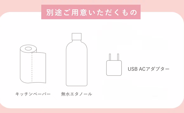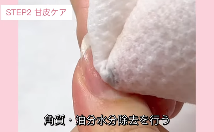 押し上げたらキッチンペーパーに無水エタノールを含ませて親指に巻き付けます。クルクルと掃除するように甘皮周りの角質を除去し、爪全体を拭き取り爪の表面の油分•水分を除去します。