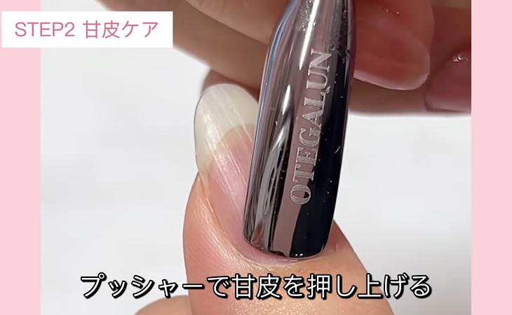 プッシャーを使用し、根元の甘皮を痛くない程度に優しく押し上げます。