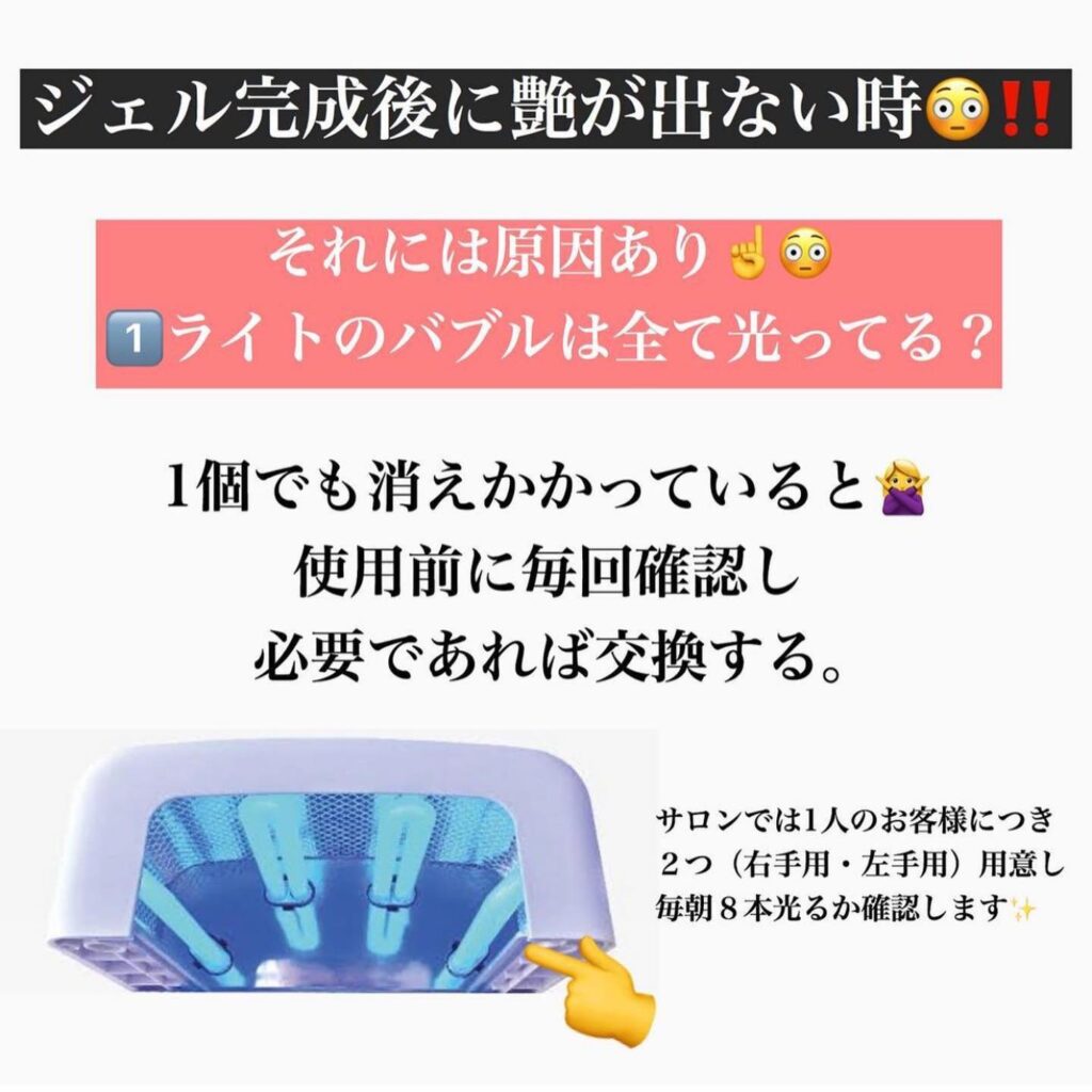1つでもライトが消えかかっているとダメです。使用前には、必ず毎回確認し、必要であれば交換します。マオネイルサロンでは、1人のお客様につき2つ(右手用・左手用)用意し、毎朝8本光るか確認しています◎