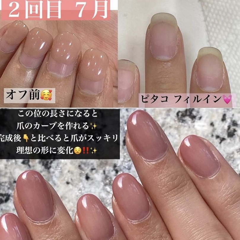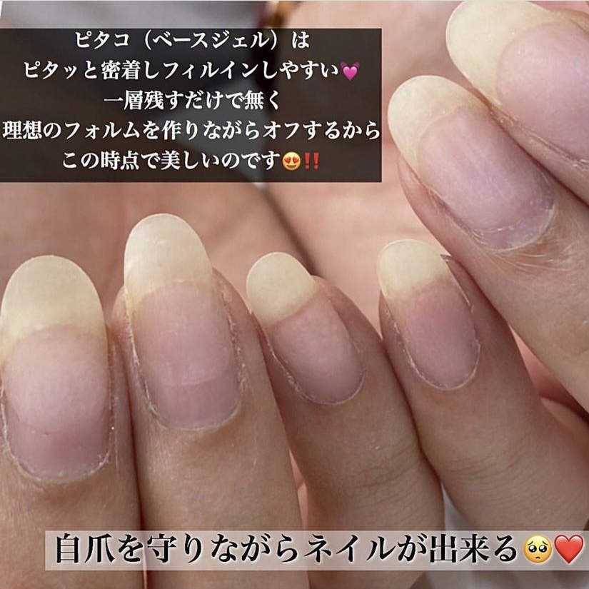 ベースのピタコ、トップのヌレコ を使用し、 アセトンを一切使わずマシンで表面オフし、ベースを一層残すフィルイン技術で自爪を削らないオフ法です.