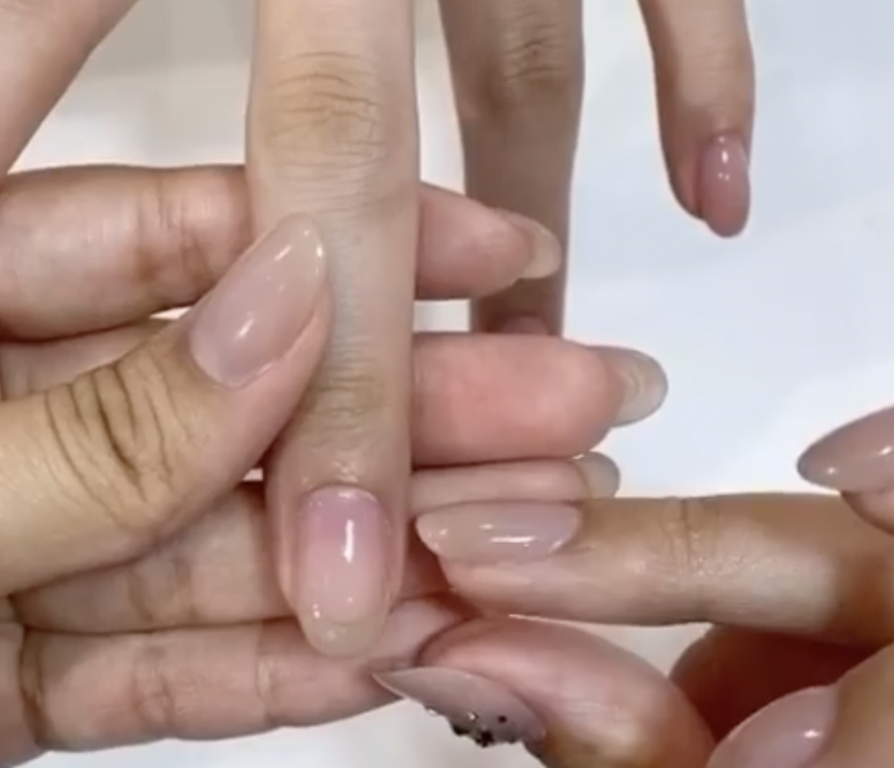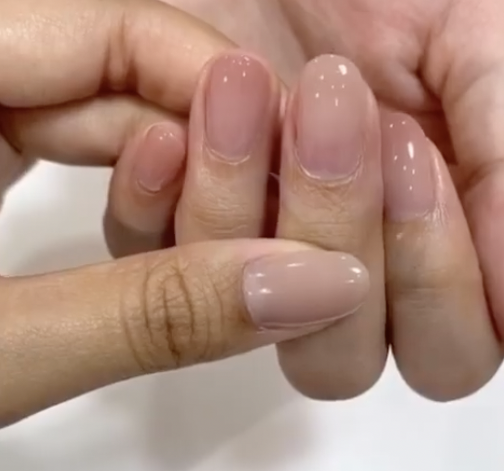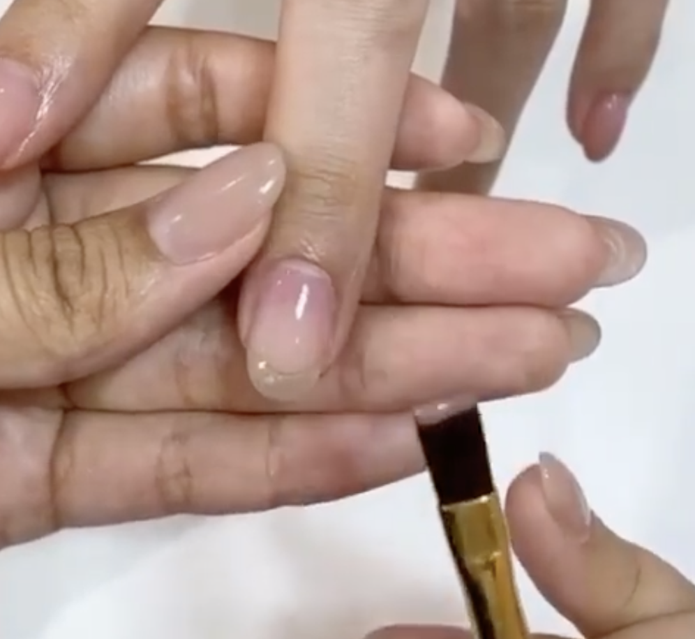 まず先端に置いたら、ほぼ筆には付いてない状態で指を傾けて、スキンアップしながら際まで塗っていきます。